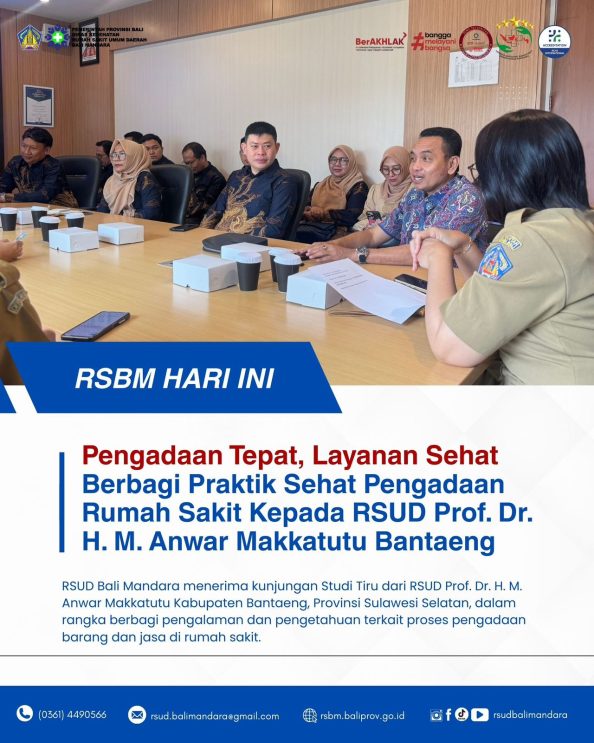 RSUD Bali Mandara menerima kunjungan Studi Tiru dari RSUD Prof. Dr. H. M. Anwar Makkatutu Kabupaten Bantaeng, Provinsi Sulawesi Selatan, dalam rangka berbagi pengalaman dan pengetahuan terkait proses pengadaan barang dan jasa di rumah sakit. Kedatangan tim dari RSUD Prof. Dr. H. M. Anwar Makkatutu Kabupaten Bantaeng dipimpin langsung oleh dr. H. Sultan, M.Kes selaku […]